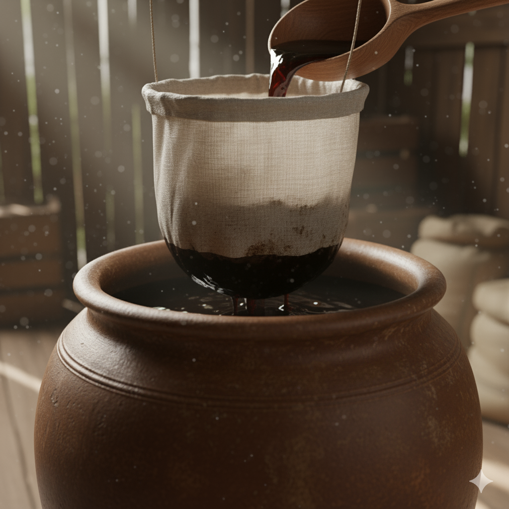Campuran kemudian disaring dengan teliti untuk memisahkan partikel gula dan kotoran, sehingga menghasilkan cairan kecap yang bersih dan halus.